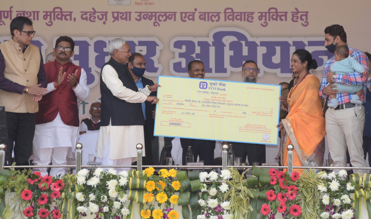 मुख्यमंत्री ने कहा कि आप सबों ने संकल्प लिया है, इसके लिए मैं आप सबको धन्यवाद देता हूँ। लोगों को हमेशा जागरुक करते रहिए। विकास के साथ-साथ समाज सुधार भी जरुरी है। हमलोग आपको आश्वस्त करते हैं कि विकास का काम और तेजी से आगे बढायेंगे आप सभी आपस में प्रेम और भाईचारा का भाव रखें। मिलकर चलेंगे तो तेजी से तरक्की होगी। आप सब को हृदय से धन्यवाद। जनसभा में शामिल होने से पहले मुख्यमंत्री ने जीविका द्वारा सतत् जीविकोपार्जन योजना, जीविका प्रोत्साहित जलवायु परिवर्तन अनुकूल खेती, दीदी की रसोई, मधुमक्खी पालन, गैर कृषि एवं सूक्ष्म उद्यम आधारित गतिविधियां आदि से संबंधित लगाई गई चित्र प्रदर्शनी का अवलोकन किया। मुख्यमंत्री ने सतत् जीविकोपार्जन योजना के अंतर्गत 1875 हितग्राहियों को 3.42 करोड़ रुपये का डमी चेक एवं विभिन्न बैंको के माध्यम से 7348 स्वयं सहायता समूहों को कैश क्रेडिट लिमिट के तहत 257.27 करोड़ का डमी चेक प्रदान किया। जल-जीवन-हरियाली योजना अंतर्गत 20 नवसृजित सार्वजनिक जलाशयों के रख-रखाव एवं प्रबंधन हेतु स्वयं सहायता समूहों को 22.40 लाख रुपये का सांकेतिक पत्र प्रदान किया गया। सड़क दुर्घटना में मृतक के आश्रित अमिता कुमारी एवं उषा देवी को 5 लाख रुपये का मुआवजा दिया गया। अंतरजातीय विवाह प्रोत्साहन अनुदान योजना के तहत कीर्ति प्रिय- प्रशांत कुमार एवं कोमल देवी- राहुल कुमार चौधरी को प्रोत्साहन स्वरूप 1-1 लाख रुपये का चेक मुख्यमंत्री ने प्रदान किया। जीविका दीदियों के साथ संवाद कार्यक्रम के अंतर्गत जीविका समूह की दीदियों ने शराबबंदी, बाल विवाह एवं दहेज प्रथा मुक्त समाज बनाने के साथ ही समाज सुधार अभियान के प्रति अपनी-अपनी प्रतिबद्धता जाहिर की।
