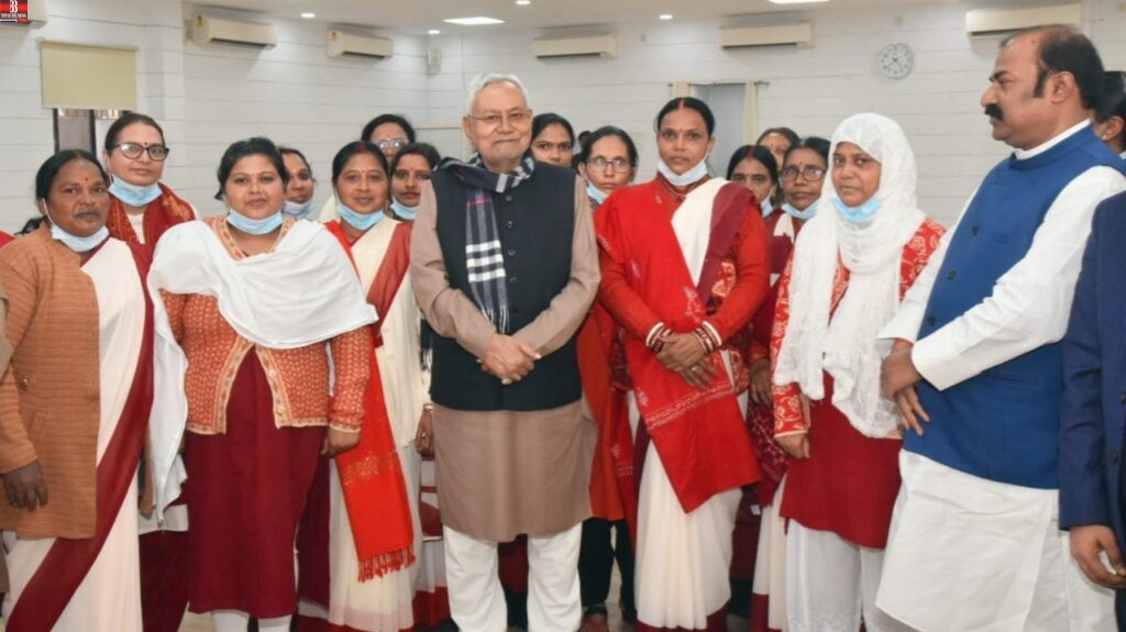 मुख्यमंत्री नीतीश कुमार से 1 अणे मार्ग स्थित ‘लोक संवाद’ में बिहार राज्य के आंगनबाड़ी सेविकाओं एवं सहायिकाओं के शिष्टमंडल ने शिष्टाचार मुलाकात की। शिष्टाचार मुलाकात के क्रम में आंगनबाड़ी सेविकाओं एवं सहायिकाओं ने अपनी समस्यायें मुख्यमंत्री के समक्ष रखीं।