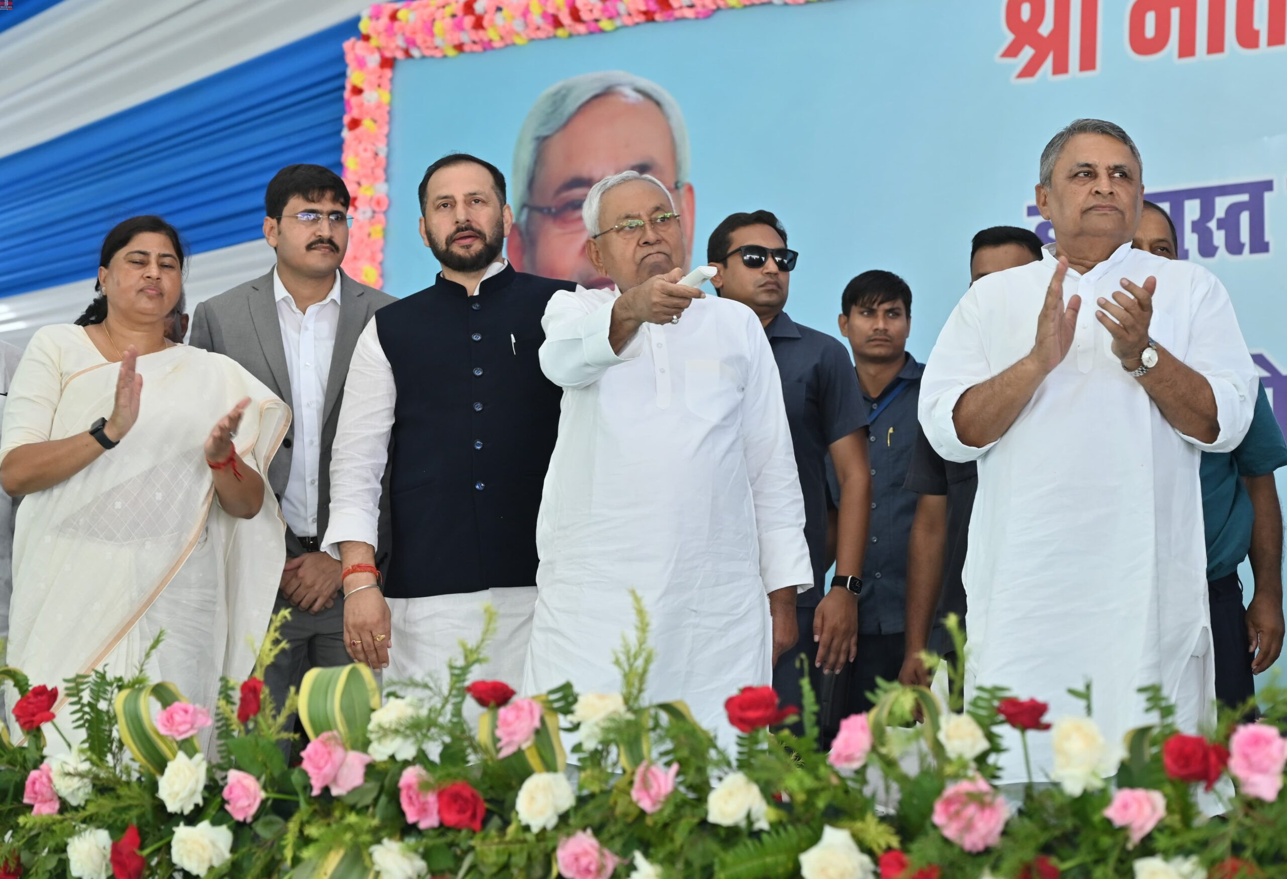 मुख्यमंत्री ने कहा कि दो बार गलती से हमलोग उधर चले गये लेकिन अब यह गलती कभी दोबारा नहीं करेंगे। हम लोग पूरी मजबूती के साथ एकजुट रहकर बिहार की तरक्की और जनता की भलाई के लिए काम करते रहेंगे। आप सभी इस कार्यक्रम में शामिल हुए। पुनः मैं आपका अभिनंदन करता हूं और आप सबके प्रति आभार प्रकट करता हूं। कार्यक्रम को जल संसाधन सह संसदीय कार्य मंत्री विजय कुमार चौधरी, लोक स्वास्थ्य अभियंत्रण सह बिहार जिला के प्रभारी मंत्री नीरज कुमार बबलू, खाद्य एवं उपभोक्ता संरक्षण मंत्री लेशी सिंह, विधायक तार किशोर प्रसाद एवं विधायक विजय सिंह ने भी संबोधित किया। कार्यक्रम में जिलाधिकारी मनेश कुमार मीना, स्थानीय जनप्रतिनिधियों एवं नेताओं ने मुख्यमंत्री को पौधा, पुष्प गुच्छ, अंग वस्त्र तथा मखाना का माला पहनाकर अभिनंदन किया। इस अवसर पर जल संसाधन एवं संसदीय कार्य मंत्री विजय कुमार चौधरी, लोक स्वास्थ्य अभियंत्रण एवं कटिहार जिला के प्रभारी मंत्री नीरज कुमार बबलू, खाद्य एवं उपभोक्ता संरक्षण मंत्री लेशी सिंह, विधायक तार किशोर प्रसाद, विधायक विजय सिंह, विधायक कविता देवी, विधायक निशा सिंह, विधायक महबूब आलम, विधान पार्षद अशोक कुमार अग्रवाल, पूर्व मंत्री हेमराज सिंह, पूर्व सांसद दुलाल चंद्र गोस्वामी, पूर्व सांसद अशफाक करीम, जदयू जिला अध्यक्ष सूरज प्रकाश राय, भाजपा जिला अध्यक्ष मनोज राय, लोजपा (रामविलास) जिलाध्यक्ष संगीता देवी, मुख्यमंत्री के प्रधान सचिव दीपक कुमार, मुख्यमंत्री के सचिव कुमार रवि, आयुक्त पूर्णिया प्रमंडल संजय दूबे, पूर्णिया के पुलिस महानिरीक्षक राकेश राठी, जिलाधिकारी मनेश कुमार मीणा, पुलिस अधीक्षक वैभव शर्मा सहित अन्य गणमान्य व्यक्ति, वरीय अधिकारी एवं बड़ी संख्या में आमजन उपस्थित थे।