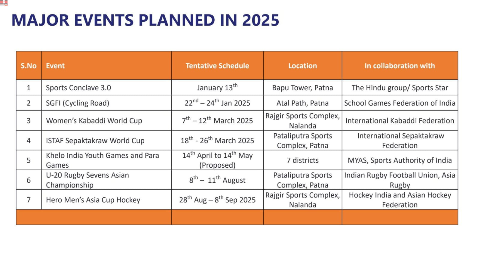 बिहार इस वर्ष विश्व कप महिला कबड्डी, विश्व कप सेपक टकराव, खेलो इंडिया यूथ गेम्स, अंडर 20 रग्बी सेवेंस एशियाई चैंपियनशिप तथा हीरो मेंस एशिया कप हॉकी की मेज़बानी करेगा। सभी कार्यक्रम बिहार के 7 मुख्य जिले में आयोजित किए जाएंगे – पटना, नालंदा, गया, भागलपुर, मुंगेर, बेगुसराई, और दरभंगा।