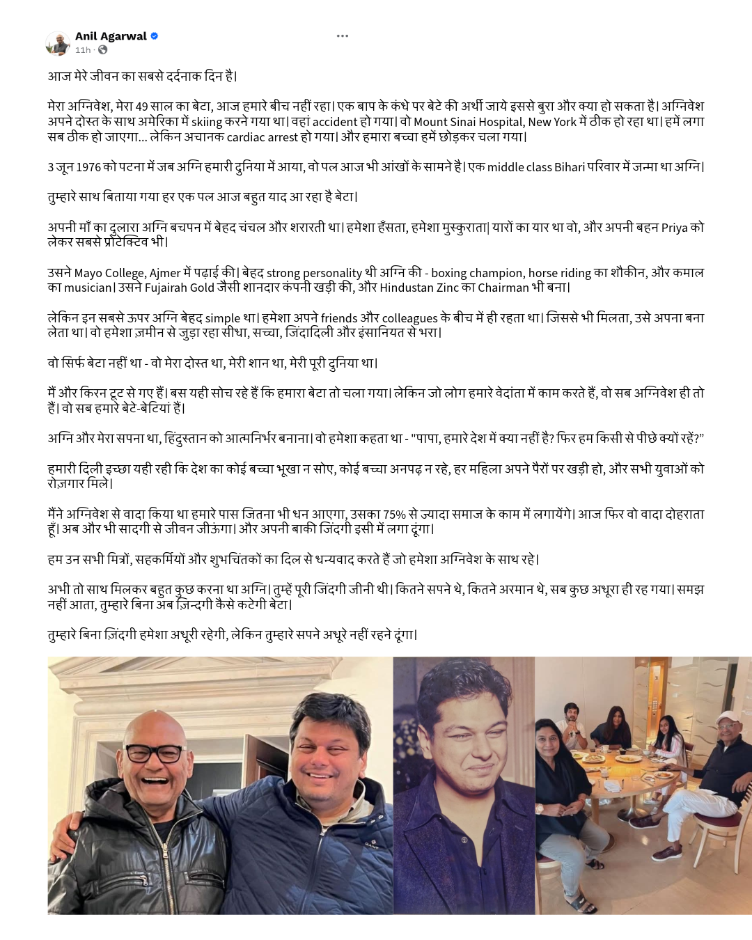 अनिल अग्रवाल ने अपने बेटे के निधन पर सोशल मीडिया पर एक लंबा भावुक पोस्ट लिखा जिसमें एक पिता का दर्द साफ झलक रहा है। उन्होंने अपने पोस्ट में लिखा है कि अग्निवेश बचपन से ही काफी मेधावी थे और वह मेरे लिए एक बेटा ही नहीं दोस्त भी थे। इतना ही नहीं वे हमेशा अपने दोस्तों और सहकर्मियों के बीच रहना पसंद करते थे। अग्निवेश हमेशा सादा और सामान्य जीवन जीते थे। उनका कहना था कि हमारे देश में ऐसा क्या नहीं है कि हमें विदेश जाना पड़ता है, पापा मेरा सपना है कि मैं भारत को आत्मनिर्भर बनाऊं। इस पोस्ट के जरिए अनिल अग्रवाल ने लिखा है कि मैं पहले भी अपनी कमाई का 75 प्रतिशत हिस्सा देश के जरूरतमंदों के लिए दान करता था और एक बार फिर से मैं वादा करता हूं कि अब और भी सामान्य जिंदगी जिऊंगा तथा देश की सेवा में अपना सर्वस्व लगा दूंगा।